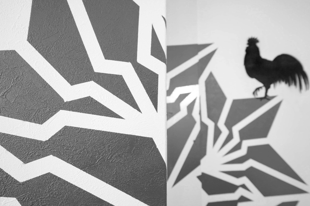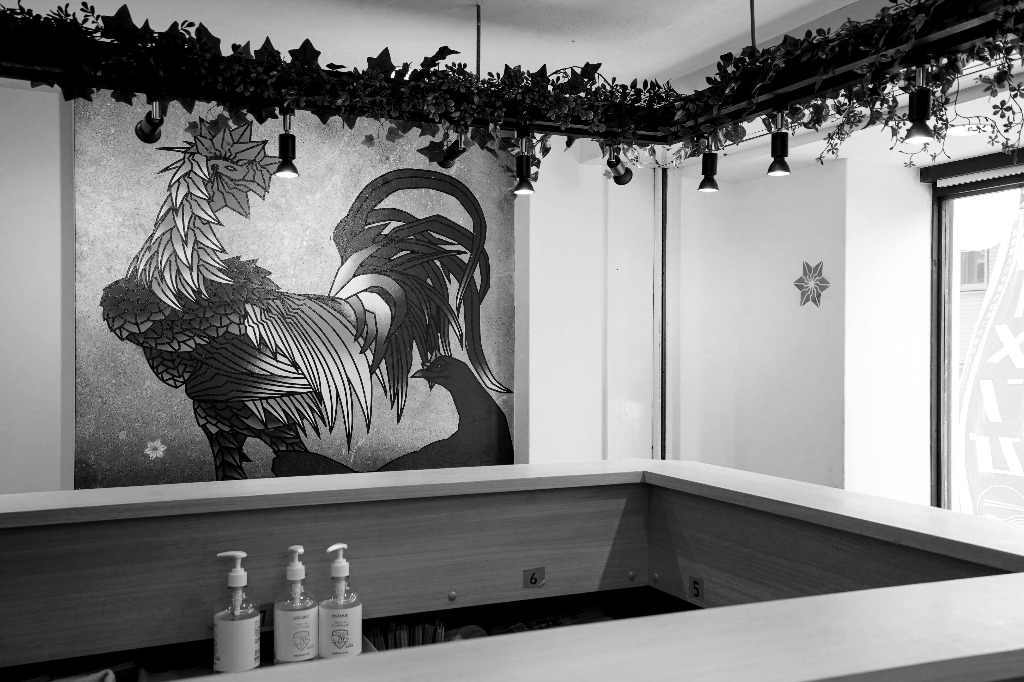 店内の壁面に描かれた大きな鶏は、和の伝統とストリートカルチャーを融合したデザインを手掛けるBAKIBAKI氏の作品です。